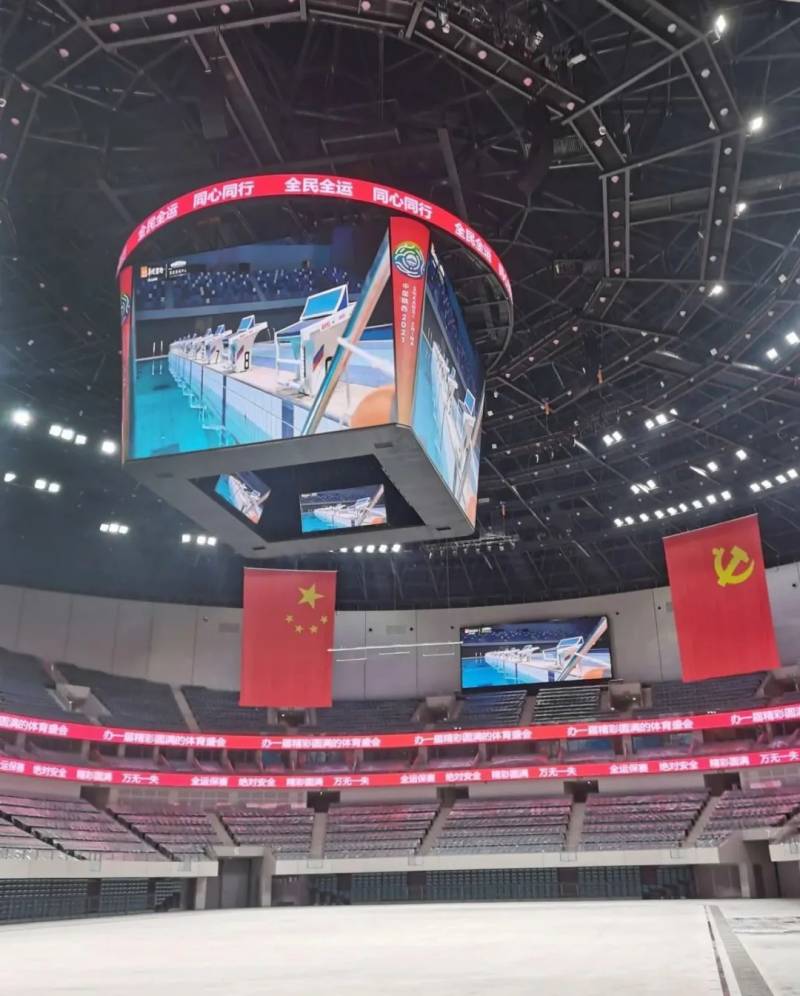 其中,西安奥体中心主体育场场馆悬挂的大型LED斗型屏、端屏、南北出入口屏、游泳跳水馆、热身馆屏等17块显示屏是由上海三思精心打造而成,总面积近900m²,其中包括特别定制的超540m² 的4K LED斗型屏。