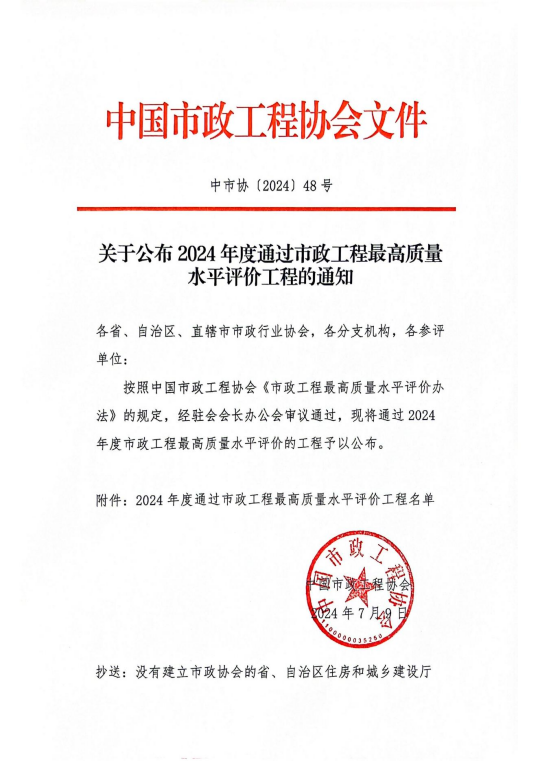 市政工程最高质量水平评价(原中国市政金杯示范工程)由中国市政工程协会组织实施,是市政工程行业在工程质量方面最高的质量水平评价,代表市政工程行业同时期国内先进水平。