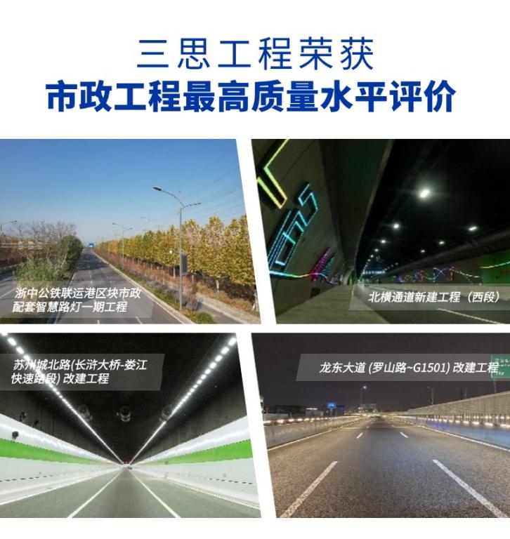 近日,中国市政工程协会公布“2024年度通过市政工程最高质量水平评价工程名单”,浙中公铁联运港区块市政配套智慧路灯一期工程(纵一、纵二、清照路)EPC 项目、北横通道新建工程(西段)、苏州城北路(长浒大桥-娄江快速路段) 改建工程及龙东大道 (罗山路~G1501) 改建工程在内由三思所承建的多项市政照明工程获“2024年度市政工程最高质量水平评价”。
