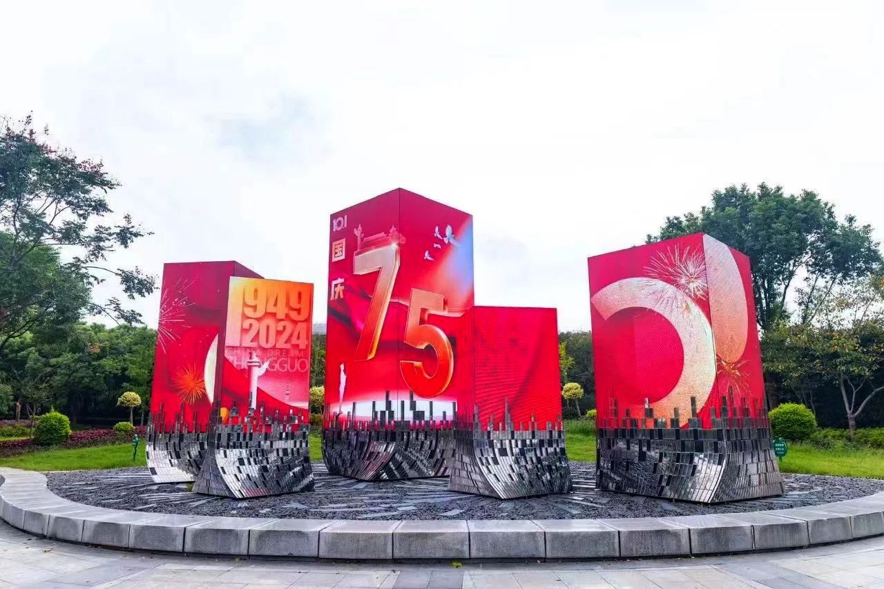 位于经开区立德道的无锡市民中心地铁口旁,中间大气端庄的金色数字“75”,以上海三思异形LED显示、裸眼3D等创新技术,搭配酷炫的3D剪纸翻页、数字浮雕效果,记录着祖国母亲走过的岁月。