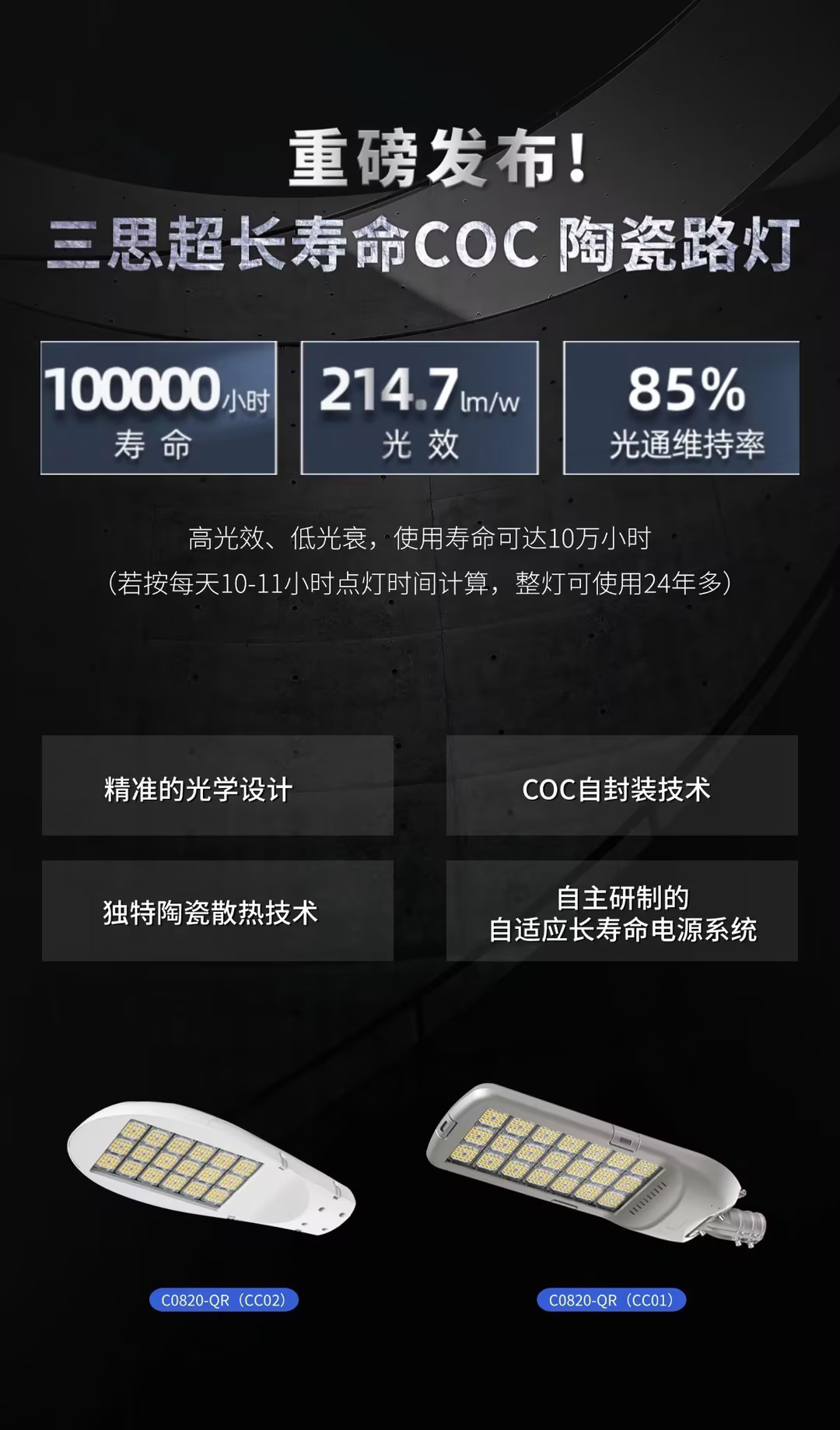 上海三思正式发布两款超长寿命COC陶瓷路灯C0820-QR(CC01)和C0820-QR(CC02)系列。