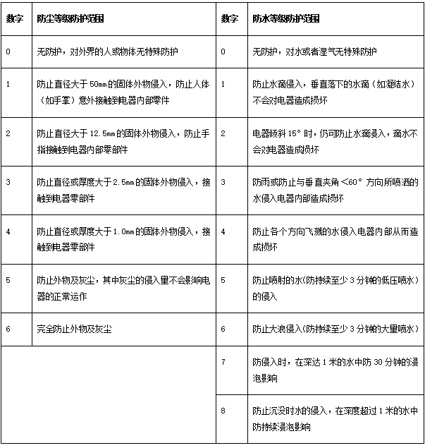 下面表格,简要标明了IP防护等级标准。