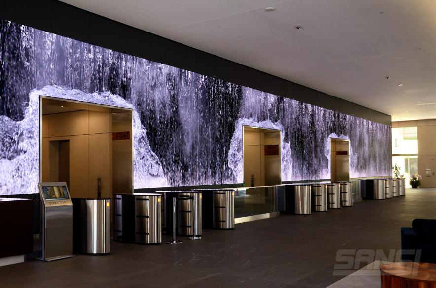 精良的显示品质配合精良的数字内容,将冰冷的建筑墙改造为超现实的神奇环境,让每一位经过这道墙的办公者抬头即可见国家森林、奔腾瀑布、延绵雪山、梦幻雪景等绝美景色,让人有一种进入迷人超现实环境的梦幻体验。
