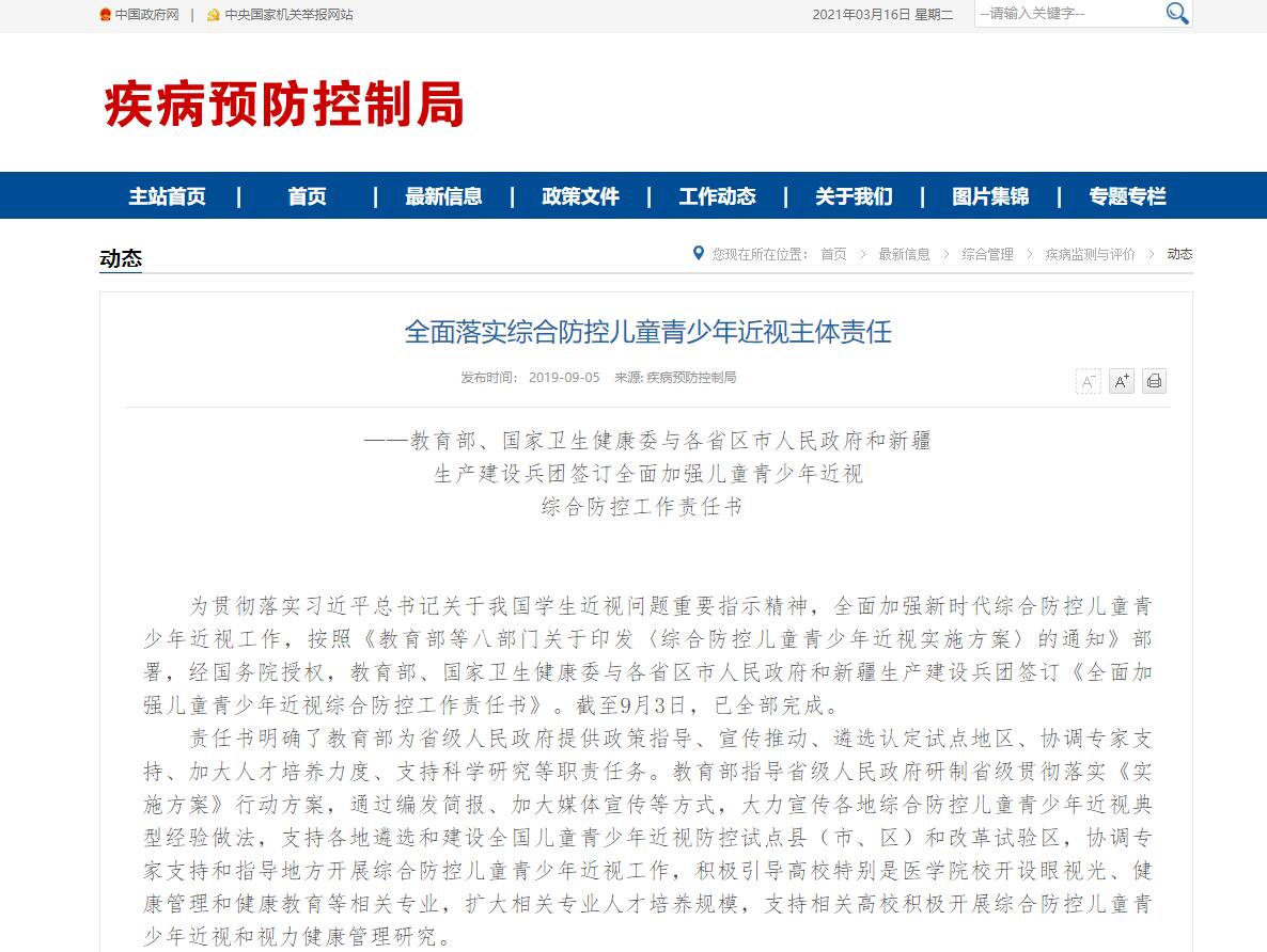 2019年,教育部、国家卫生健康委与多个省级人民政府签订《全面加强儿童青少年近视防控工作责任书》,到2023年。力争实现全国青少年总体近视率在2018年的基础上每年降低0.5个百分点以上,近视高发省份每年降低1个百分点以上。