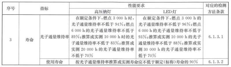 光子通量维持率:在规定条件下,在特定时间植物补光灯所发出的光子通量与初始光子通量的比值,用百分比表示。在特定条件下,高压钠灯实测20000h的光子通量维持率不低于70%,LED灯实测30000h的光子通量维持率不低于70%。
