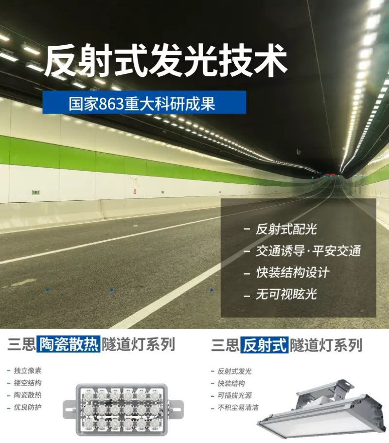 三思应用自主研制的LED反射式照明隧道灯,通过专业地隧道照明设计方案,很好地解决了隧道照明的斑马线、配光不佳等照明难题,并兼顾舒适照明、简易安装、简洁美观、交通诱导等要求。