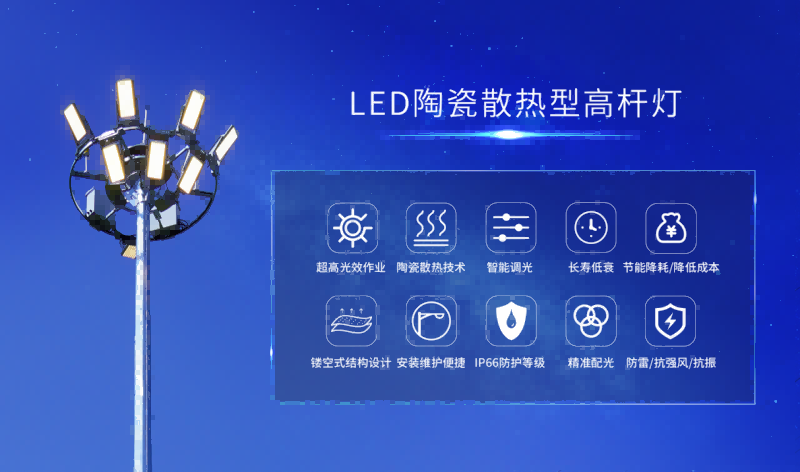 安装于重点运动会体育场馆外及生活广场的LED高杆灯是一种实用性强、性价比高的照明产品。不仅照明功能强大,作为灯饰也能美化环境,让夜间出行有生活保障。