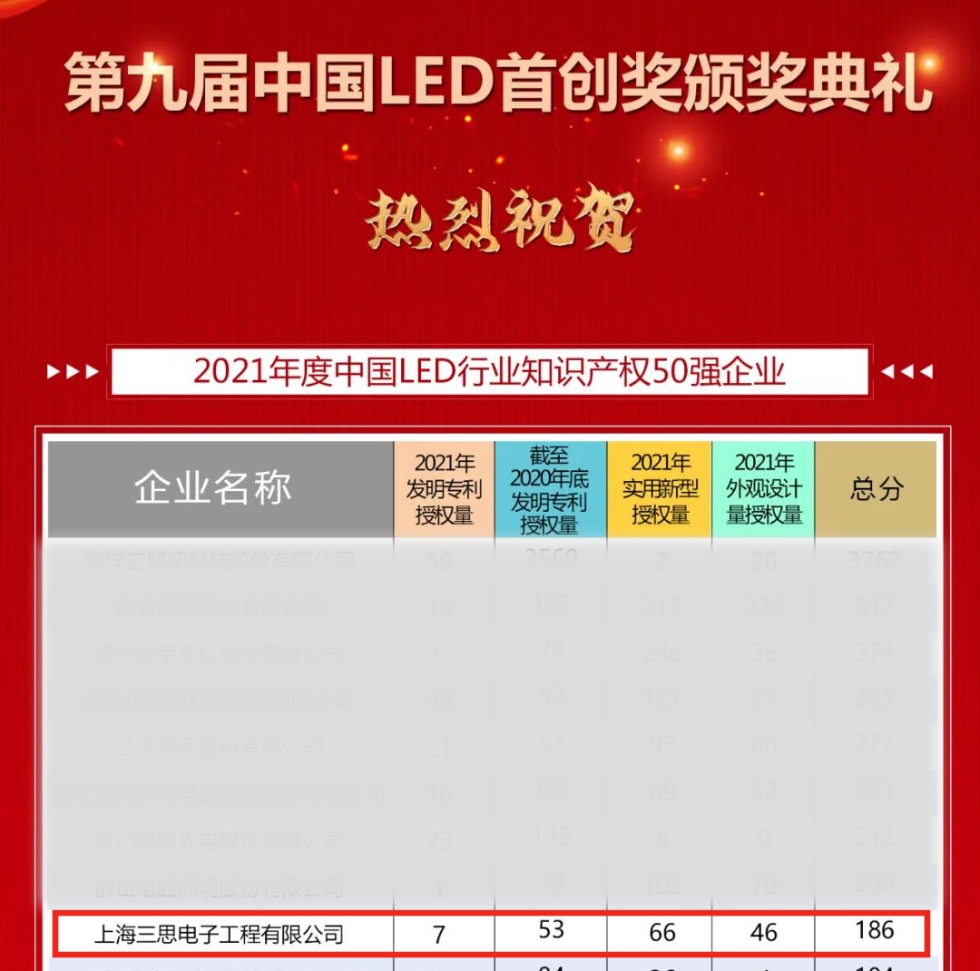 2022年8月3日,第九届中国LED首创大会在广州市广交会展馆隆重举行。大会上发布了“第九届中国LED首创奖2021年度中国LED行业营收50强、知识产权50强榜单”,上海三思强势入围前十强,获评“2021年度中国LED行业知识产权50强企业”称号。