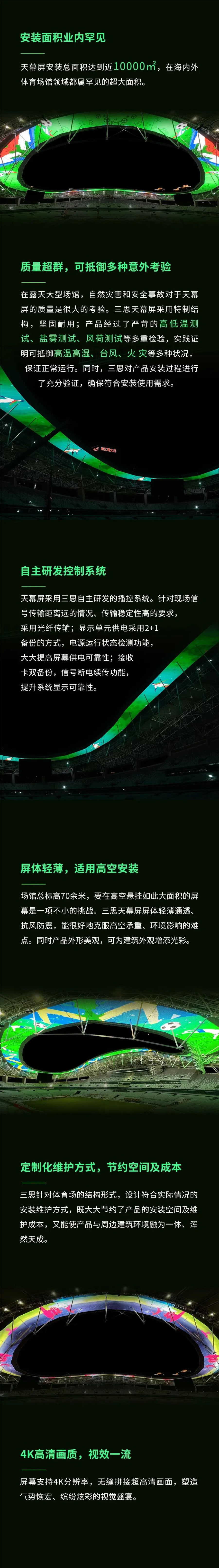 三思为上海体育场定制的近10000㎡天幕屏,在众多技术方面具有创新优势:如抵御自然灾害和安全事故的质量安保技术;屏体及结构防盐雾、防酸腐等特殊技术;安装结构创新设计与稳定技术等等,都在该项目中得到了充分展现。