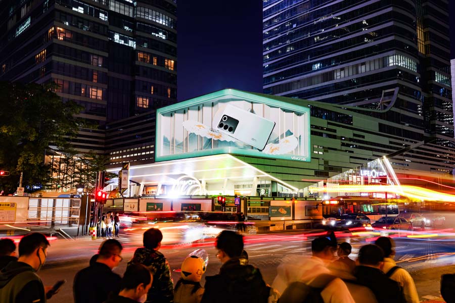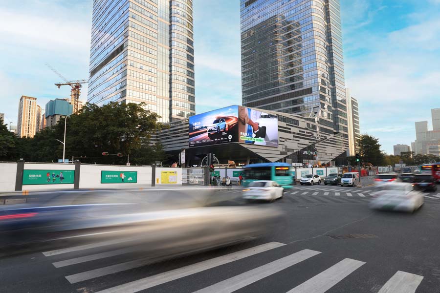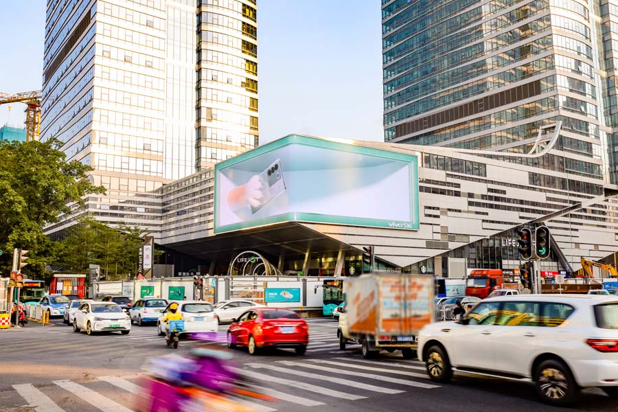 在这条“硅谷大道”的裙楼之上,新落成了一块由上海三思承建的606㎡户外裸眼3D大屏。这片覆盖上市公司多达110余家、总市值为4.25万亿元、占南山区上市公司总市值70.83%的科技园区,又新添了一处“流量密码”。