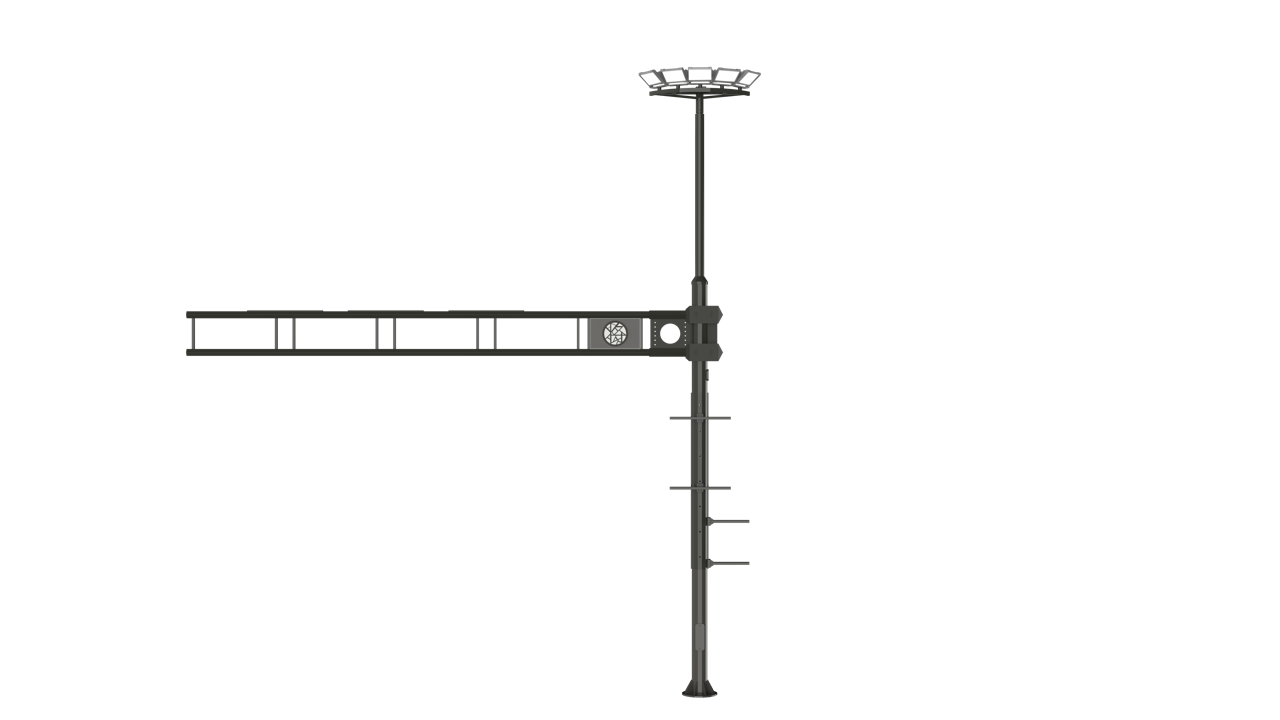 三思综合杆利用当地特色用几何图案勾勒出“将”的造型,在设计上包含了平面布置设计、杆型法兰设计、杆上搭载设施布置设计、部件选定和装配设计、综合杆基础和安装设计、杆上搭载设施接口设计、综合杆内布线设计及相关荷载计算等,综合杆挑臂法兰采用非常规的三明治结构。
