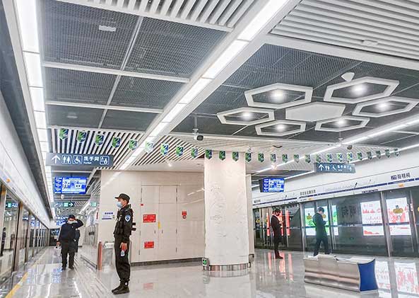 再次完成了2号线的照明系统解决方案服务重任,上海三思服务共完成了此项目一期12站(公共区和区间隧道)、二期4站(设备区)的照明设备供应,上海三思结合前期科学的照明计算手法和前沿的LED灯光技术优势,保障了安全、舒适、稳定的现代照明效果,扶梯上方采用反射式发光技术开发的照明灯具,站厅层照明照明设计方面使用直接照明、间接照明、重点照明结合应急照明与个性化照明的方式,为各区域提供优质的照明环境。