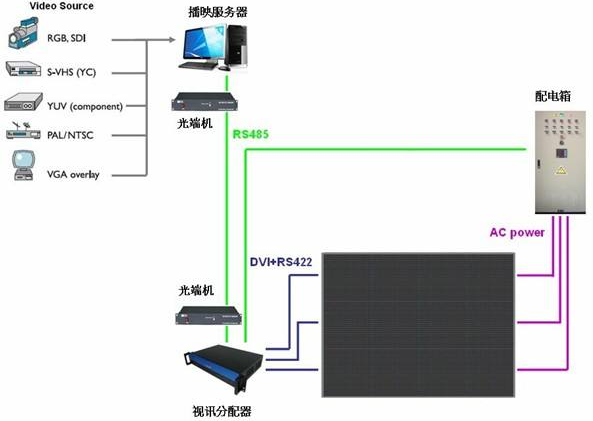 LED显示配电系统,通常情况下显示屏用电功率≤5kw可采用 AC 220V,即单相三线制供电;通常情况下屏体总用电功率≥5kw建议采用 AC 380V,即三相四线制或三相五线制供电。