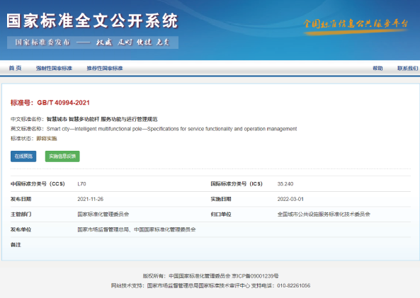 这份上海三思参与起草的文件规定了包括道路多功能杆的总体要求、基本组成、杆体设计要求、附属设施要求、检验要求以及标志、包装、运输和贮存等一系列行业标准。该标准重点指出:为满足新型智慧城市需要,需要有效管理智慧杆的长期使用,制定并规范运营服务,包含信息管理、运行监控、维护等内容,使新型多功能杆可安全支持搭载移动通信设备、智能照明设备、视频监控设备等。