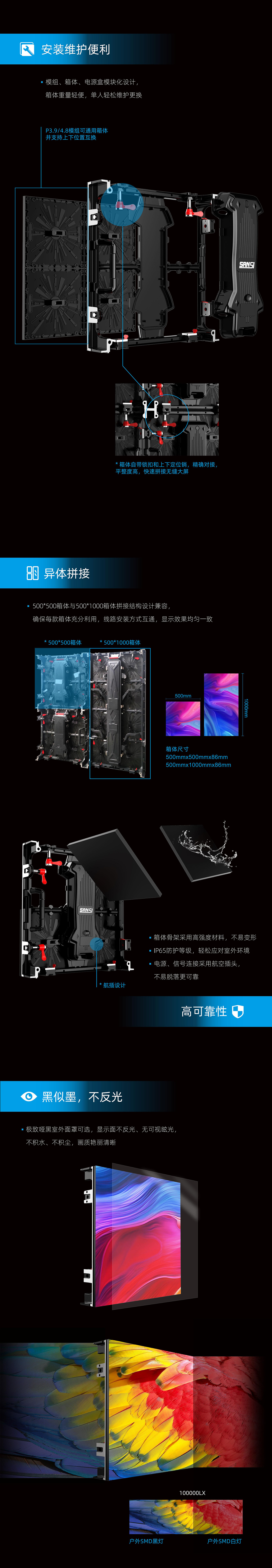 XR系列是为租赁市场量身打造的一款高性价比室外全彩显示屏产品。压铸铝一体成型的箱体平整度更高,易拼接、无缝隙,单人可快速安装。安装方式灵活,满足各种不同场合需求。1:1显示宽高比,轻松拼接不同比例大屏。箱体造型美观、走线简洁。铝合金箱体强度高、抗形变能力强,IP65防护等级,适用于大型露天活动、展览、演出、企业活动等各种室外活动场景。