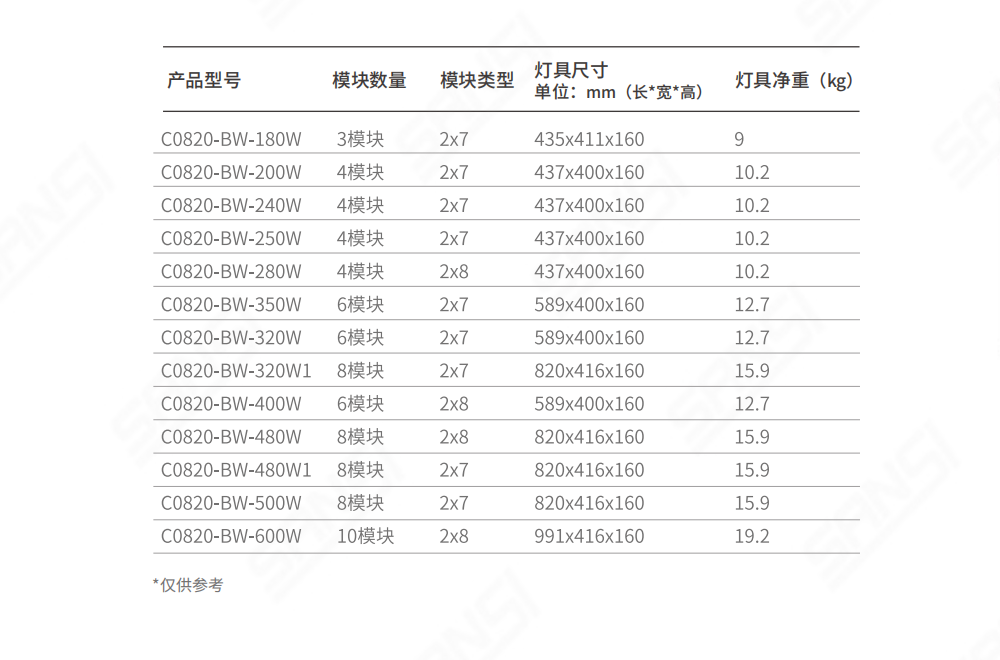 | 型号 | 输入电压 | 功率 | 功率因素 | 光效 | 色温 | 显色指数 | 防护等级 | 安装方式 |